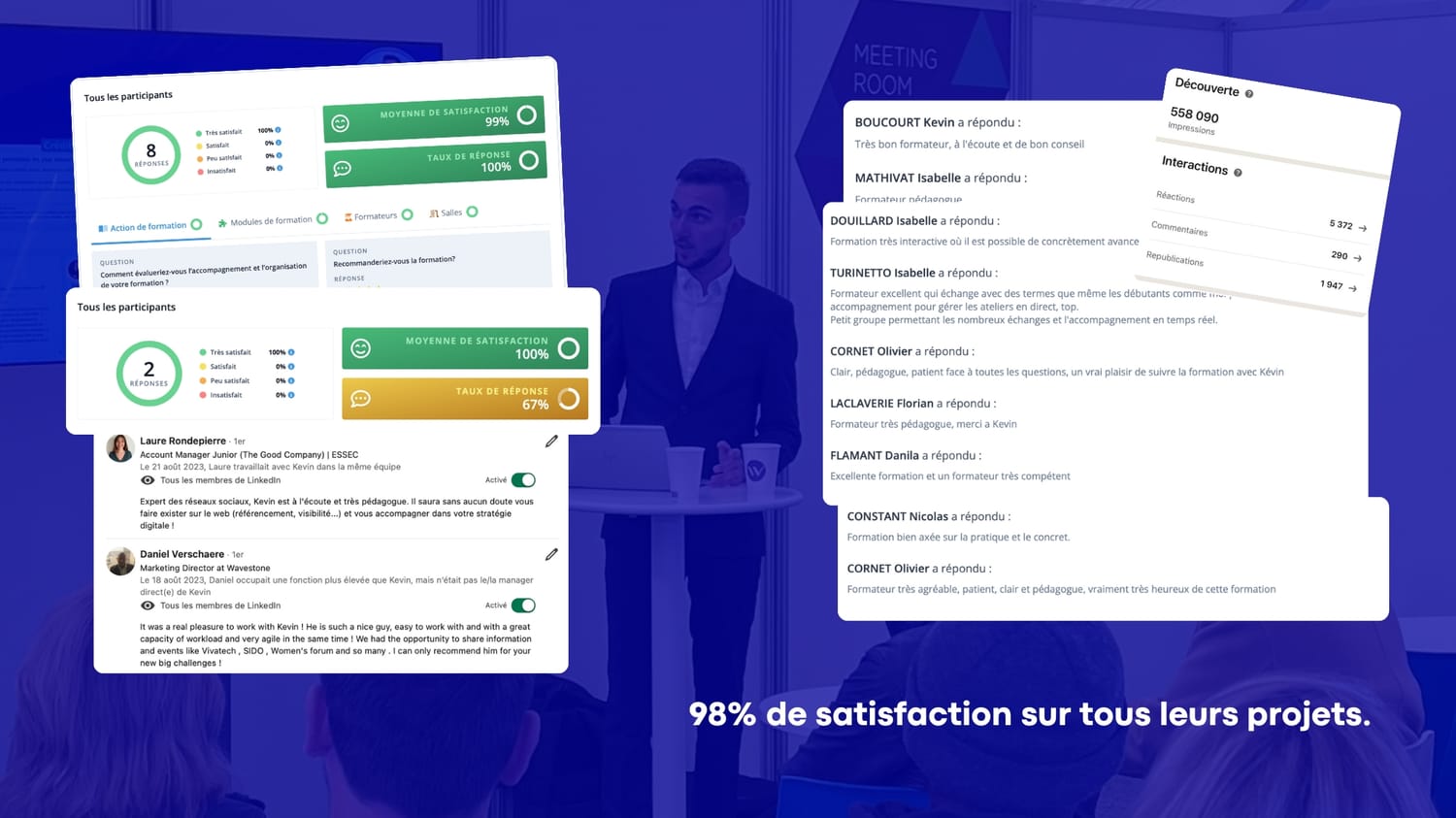 J'accompagne près de 50 entrepreneurs par an sur les réseaux sociaux parmi lesquels certains des plus grands créateurs de contenu avec un taux de satisfaction de 98,1% sur l'ensemble de mes services.